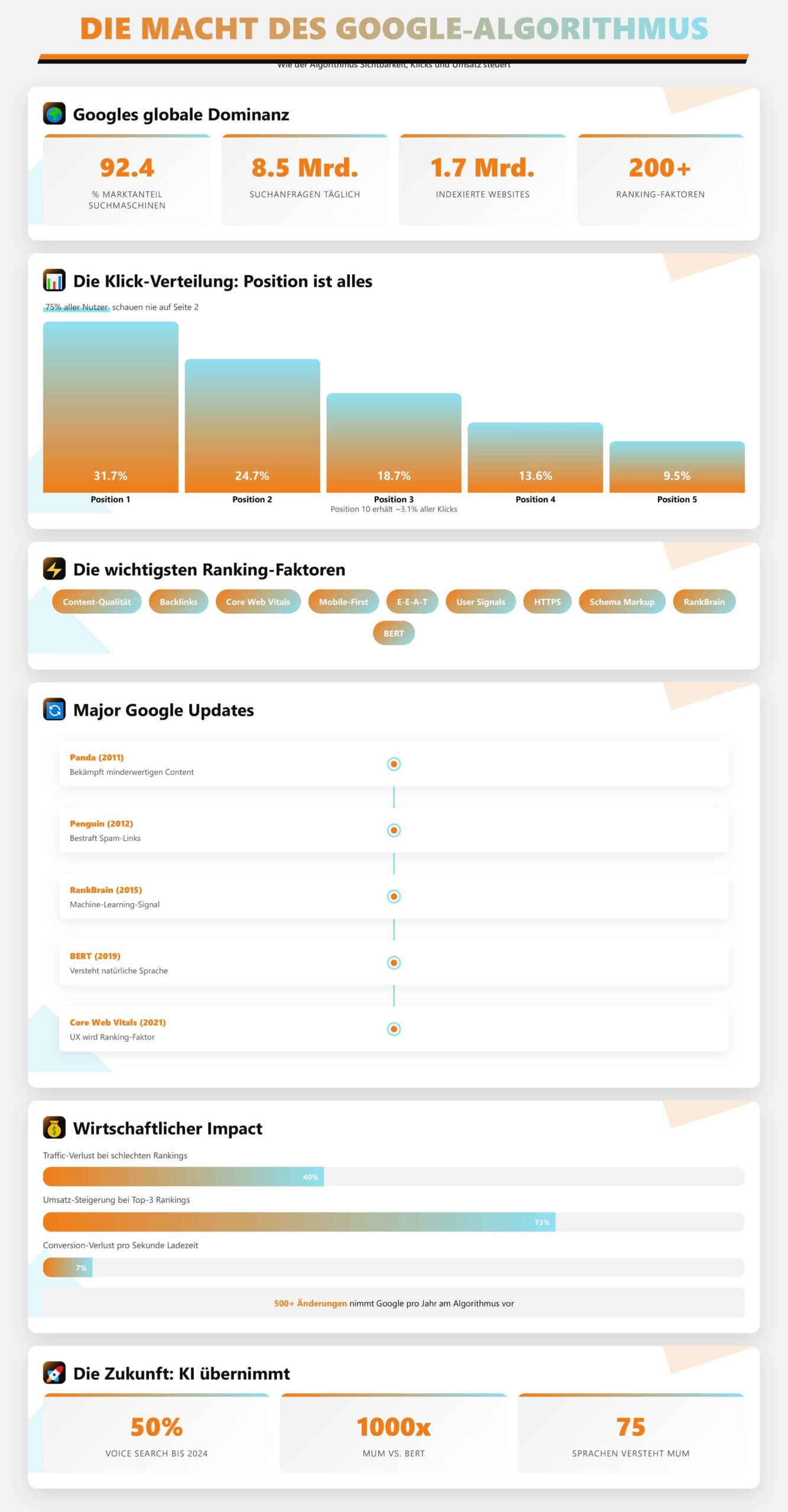 Diese Statistiken übersetzen sich direkt in Ihren Geschäftserfolg. Eine bessere Platzierung bedeutet mehr qualifizierte Besucher, mehr Anfragen, mehr Umsatz. Der Algorithmus wird damit zum stillen Teilhaber Ihres Unternehmens – ob Sie wollen oder nicht.