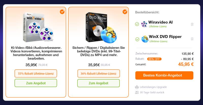 - Bundle-Option: Für zusätzliche 10 Euro erhalten Sie das Paket Winxvideo AI + DVD Ripper als Lifetime-Lizenz (Gesamtwert regulär 135,95 Euro – 65% Rabatt)