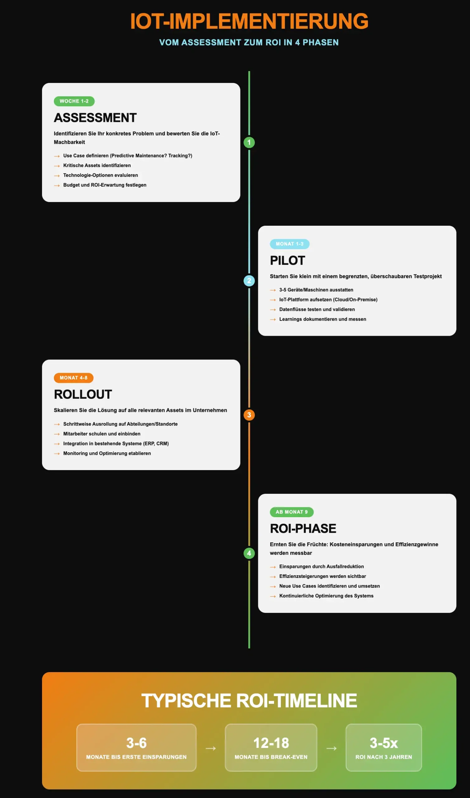 Ein Produktionsbetrieb installierte IoT-Sensoren an kritischen Maschinen. Ungeplante Ausfälle sanken um 70%. Wartungskosten reduzierten sich um 30%, weil unnötige Interventionen entfielen. ROI der IoT-Investition: 14 Monate.