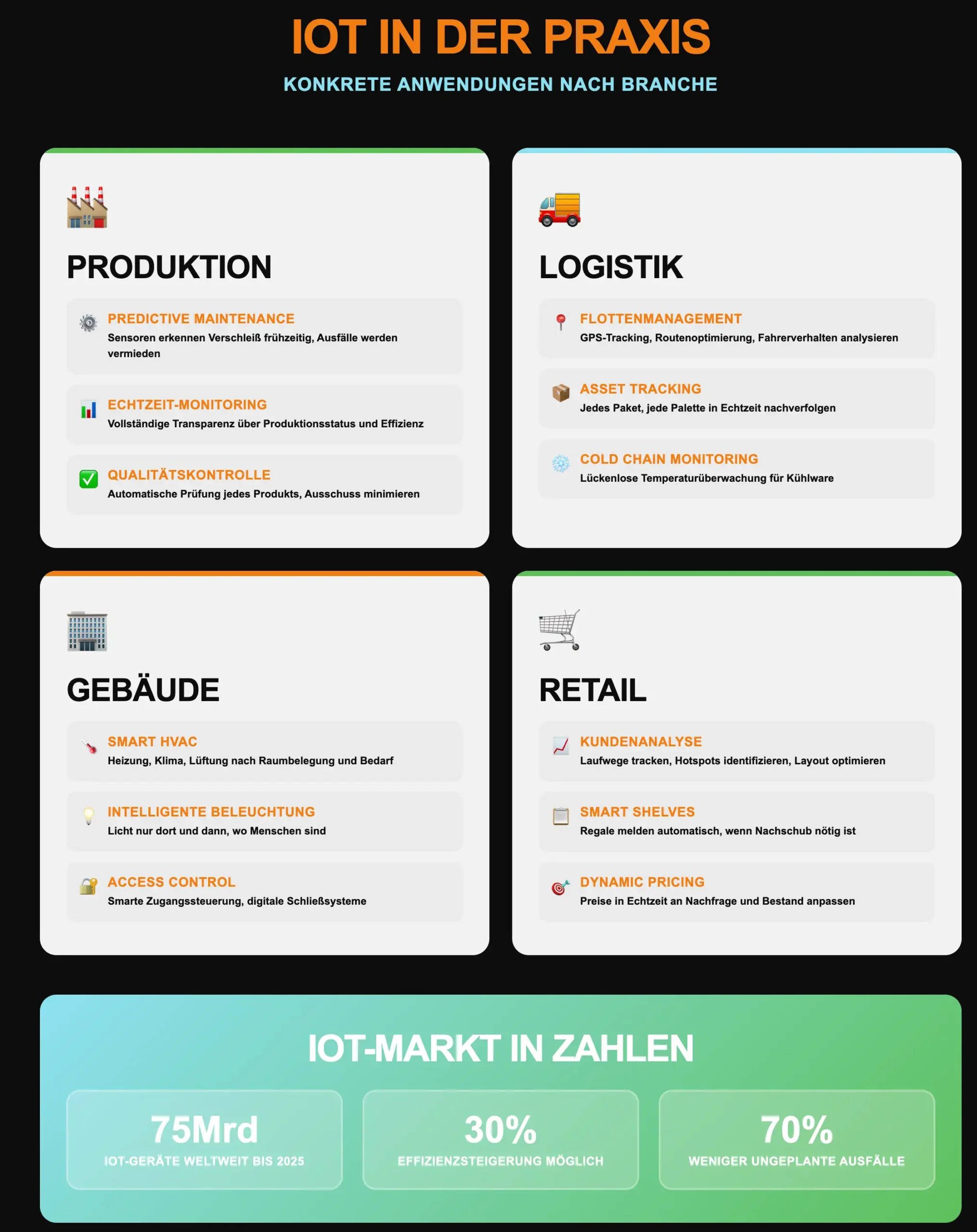 Internet of Things ist keine Zukunftstechnologie mehr – es ist Gegenwart in tausenden Unternehmen. Von der Fabrikhalle über die Lieferflotte bis zum Bürogebäude: IoT schafft Transparenz, Effizienz und neue Möglichkeiten.