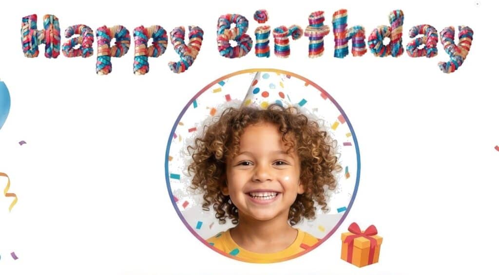 Den fertigen Texteffekt können wir jetzt direkt weiterverwenden. Weil wir uns bereits im Editor befinden, bauen wir den Schriftzug einfach in unsere Geburtstagskarte ein, mit Ballons, Konfetti und allem, was dazu gehört.